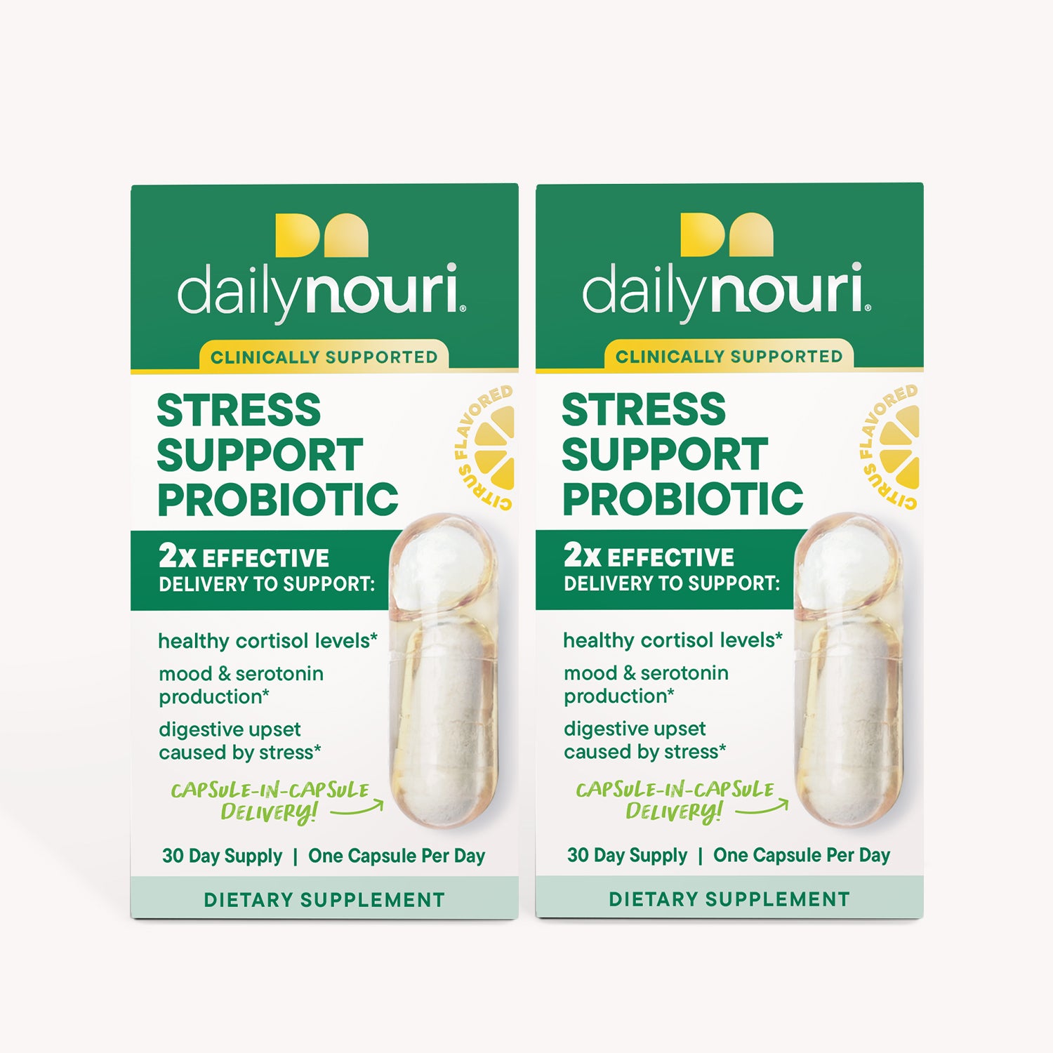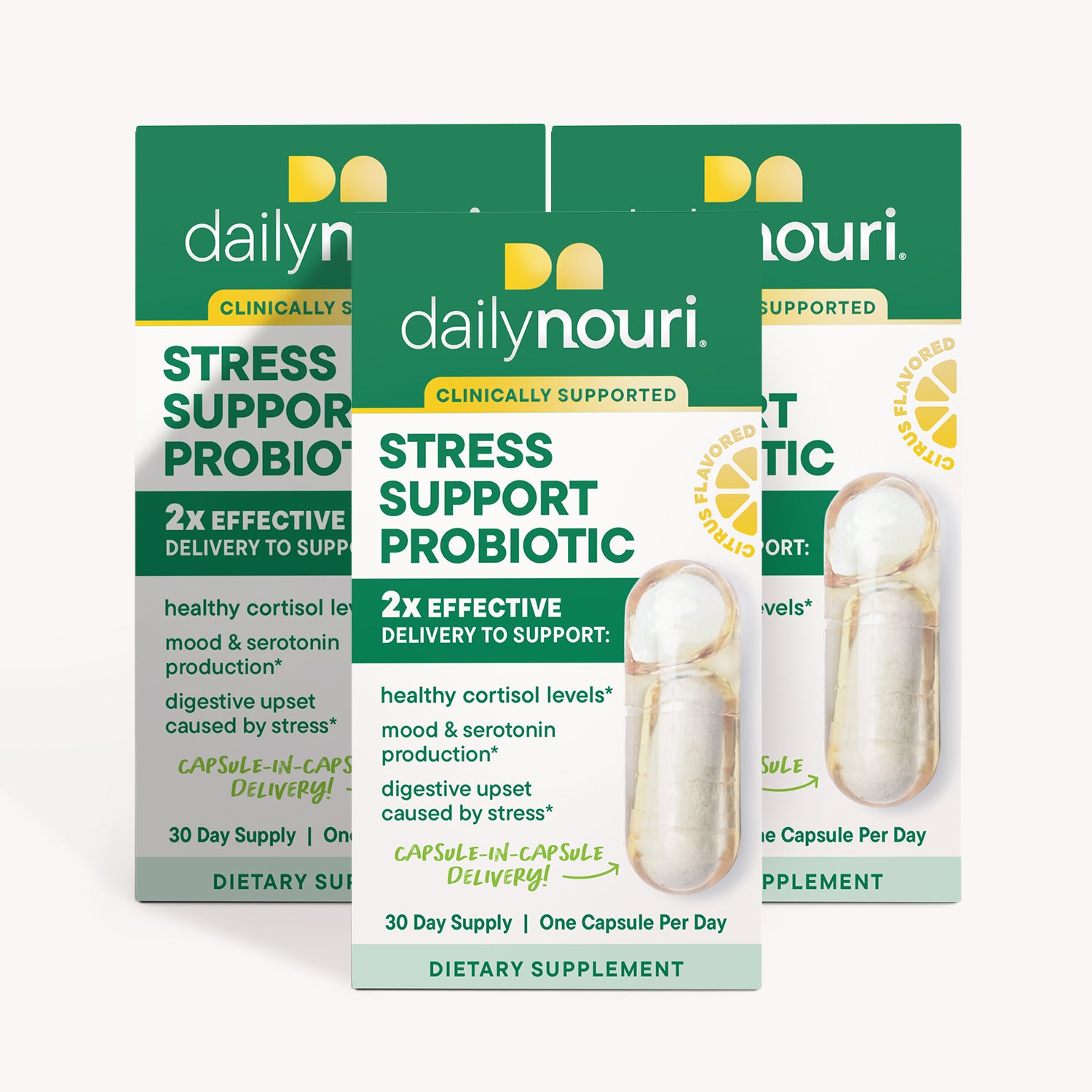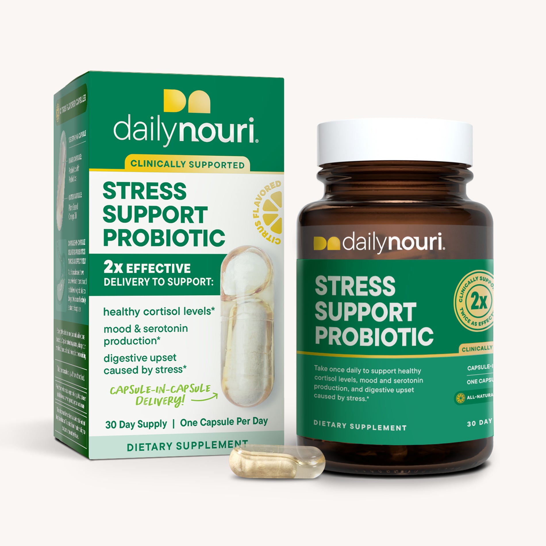 The Daily Nouri Stress Support Probiotic blend combines clinically supported probiotics to: