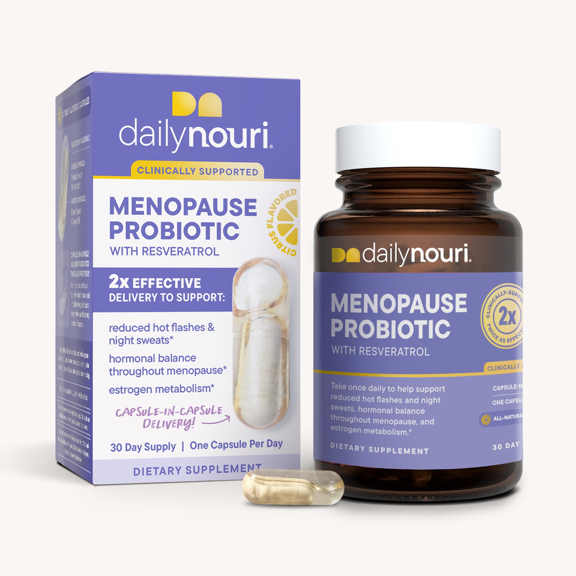 Daily Nouri Menopause Probiotic with Resveratrol helps relieve common perimenopause, menopausal, and post-menopausal discomforts, such as hot flashes and night sweats.