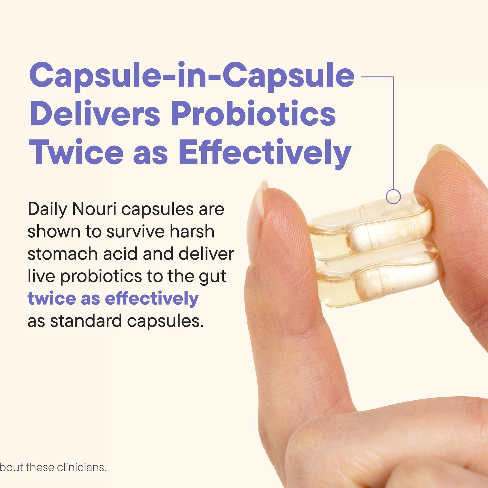 Daily Nouri capsules are engineered to survive harsh stomach acid and deliver live probiotics to the gut twice as effectively as standard capsules.