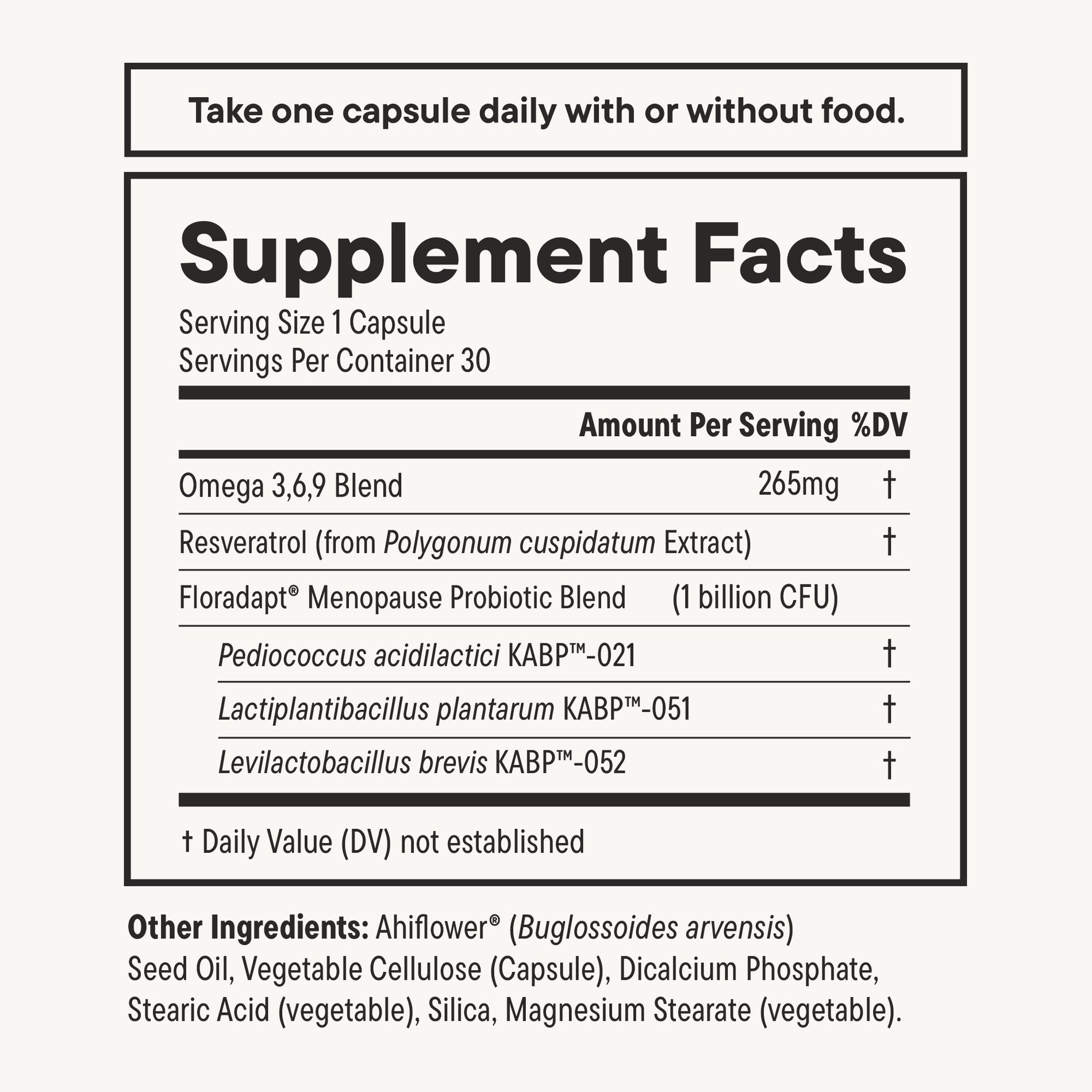 Daily Nouri Menopause Probiotic capsules combine precision probiotic strains clinically proven to support healthy estrogen metabolism, hormonal balance, and microbiome diversity with Ahiflower® Oil and antioxidant rich resveratrol.